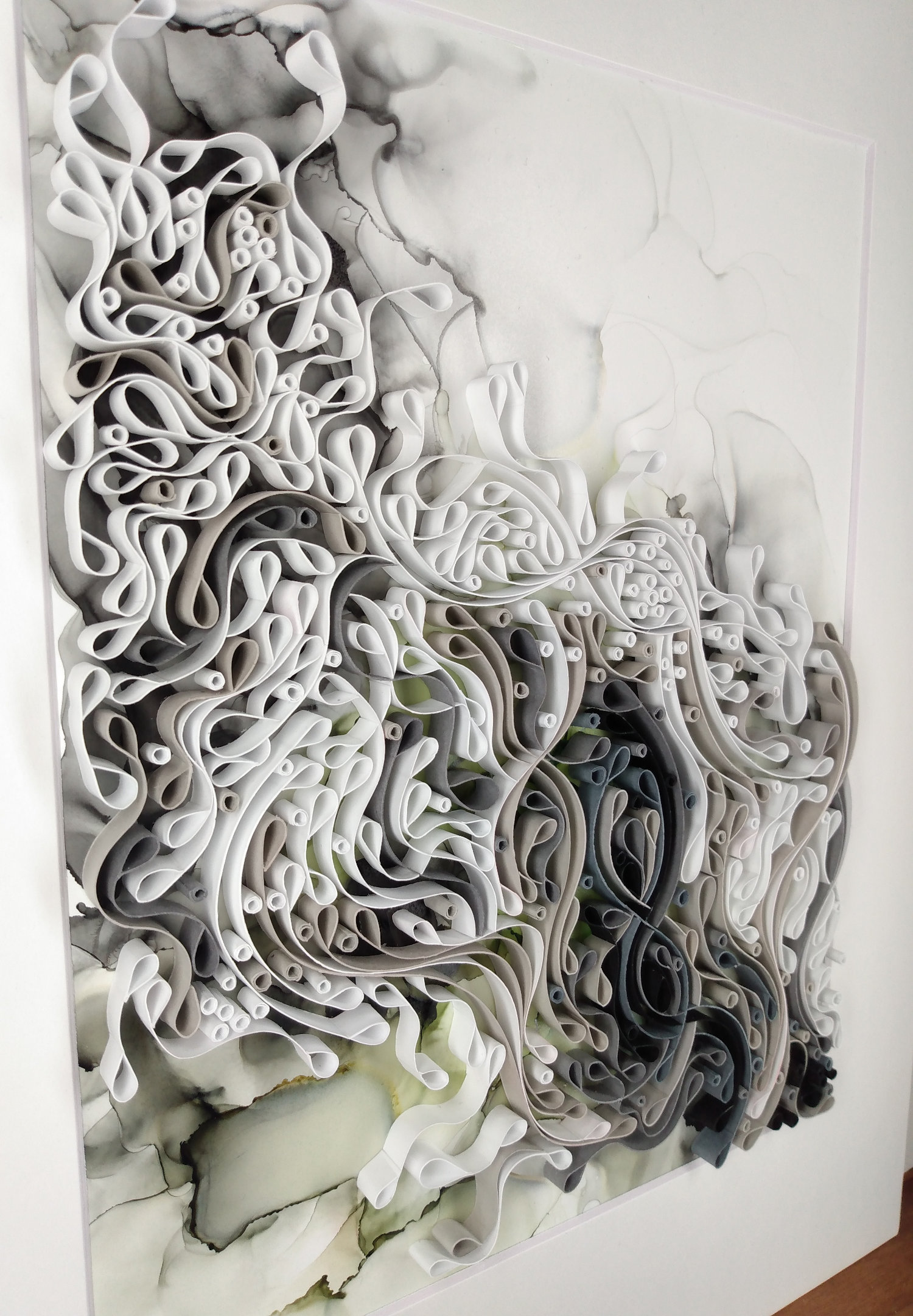 By default each piece comes sealed with a matte sealent spray, framed with a white mat, and in a shallow white shadowbox. Custom frames in other styles are an extra charge.